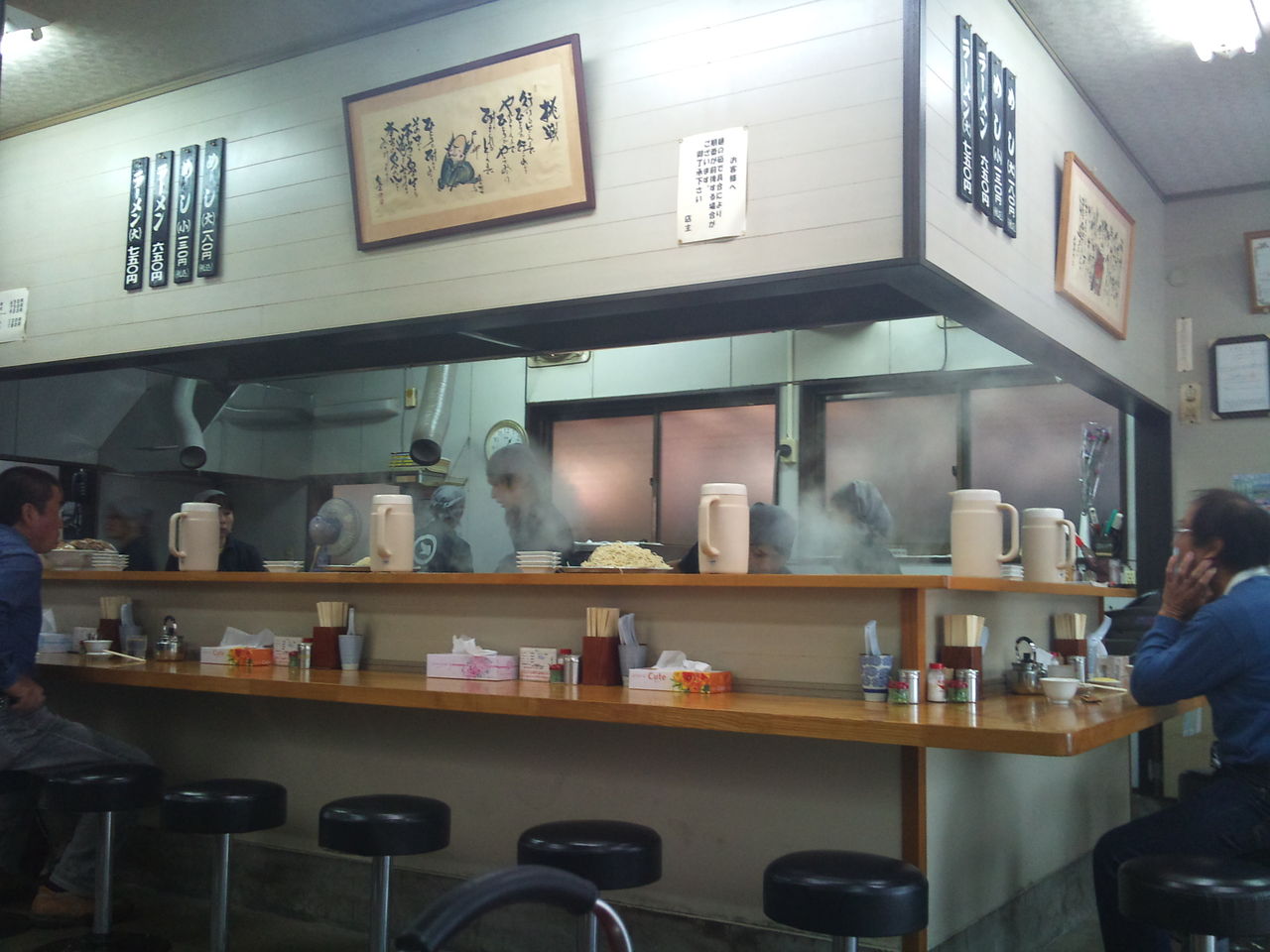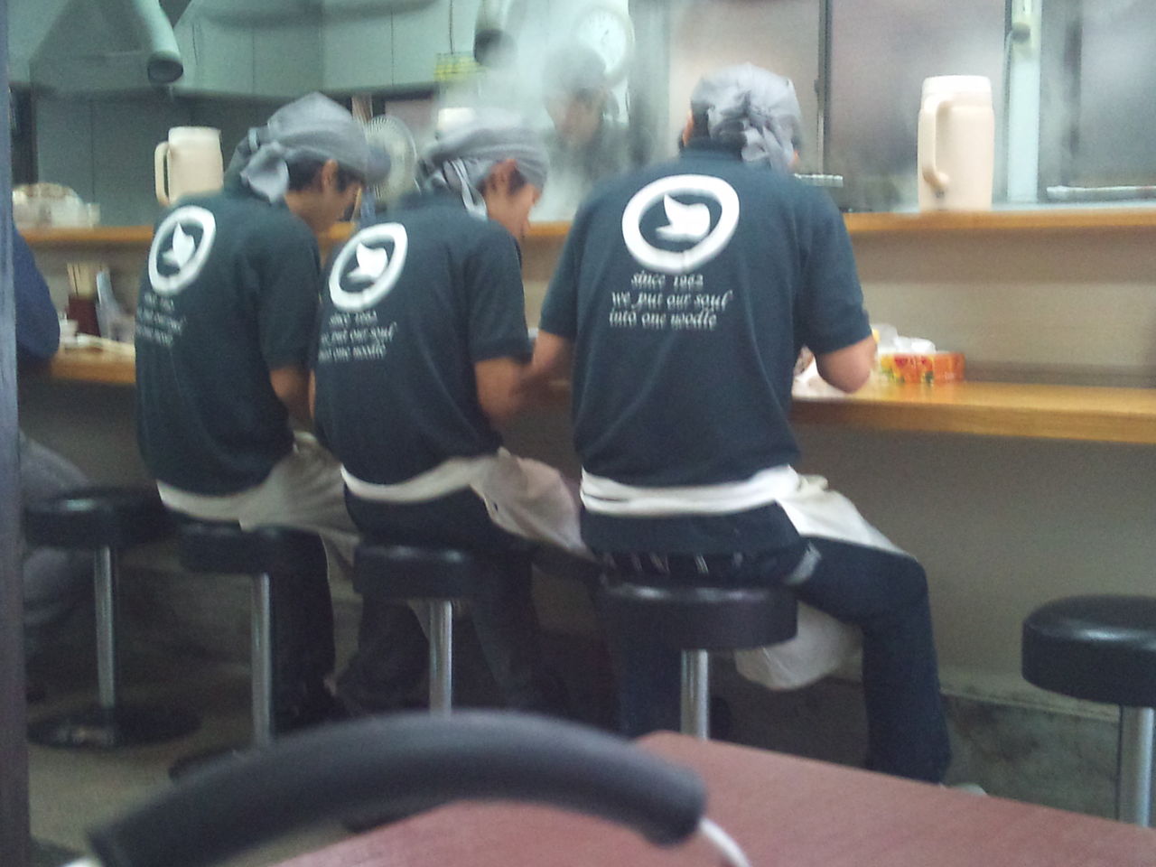 カウンターでまかないラーメンを食しはじめる