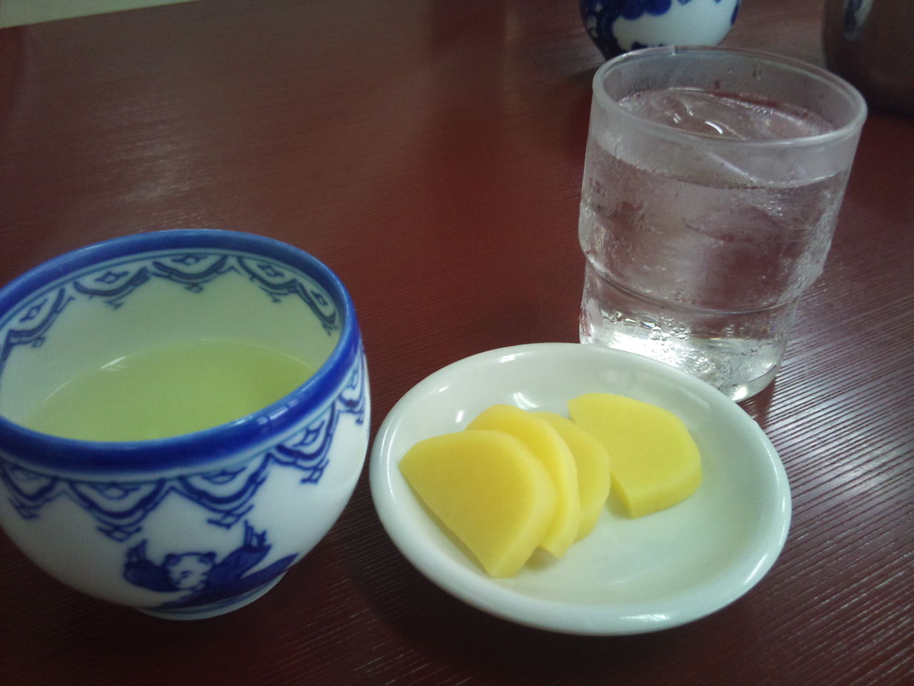 茶と水と漬け物(たくあん)。