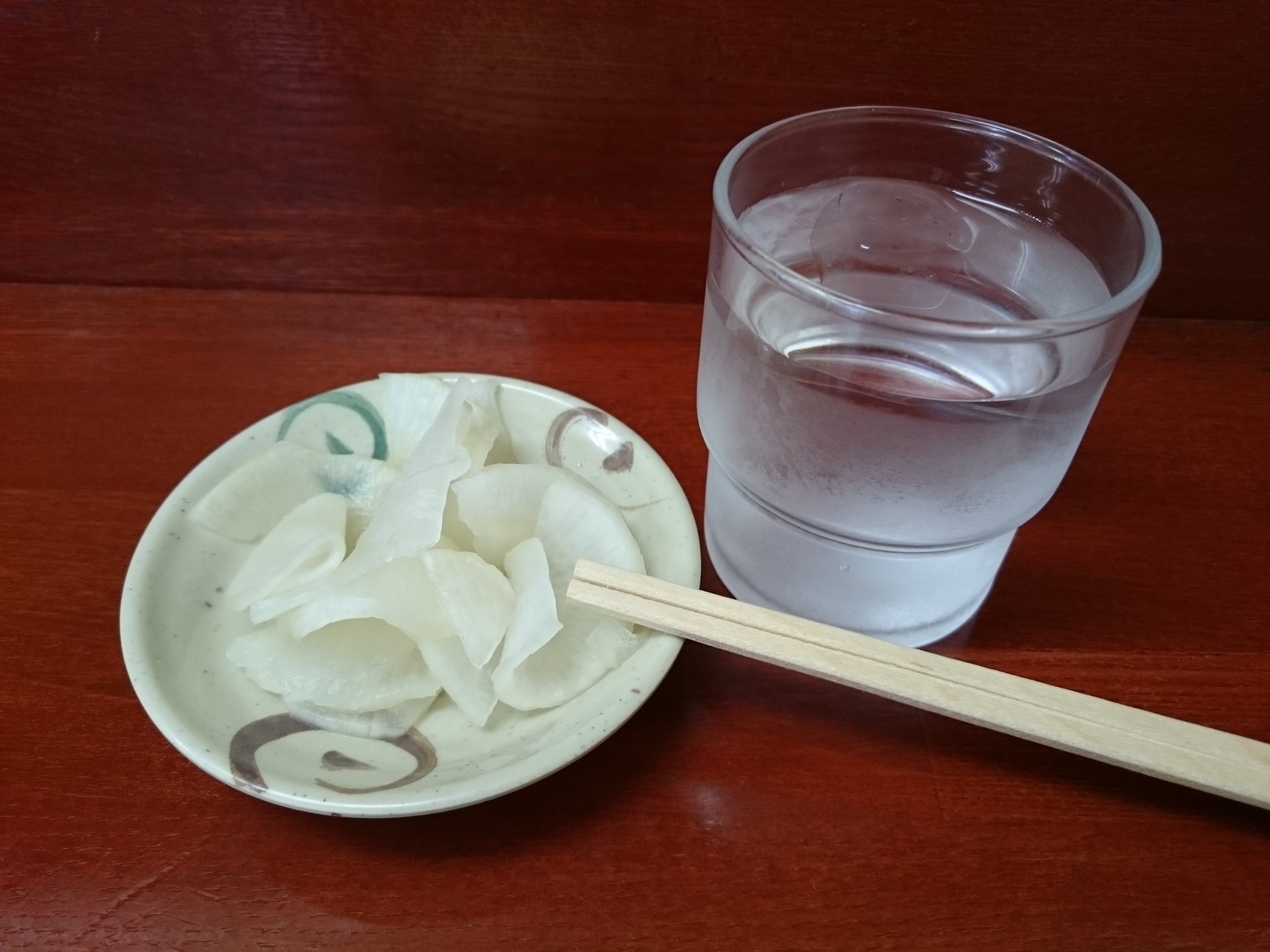 運ばれてきたのはお冷やとダイコンの漬け物。