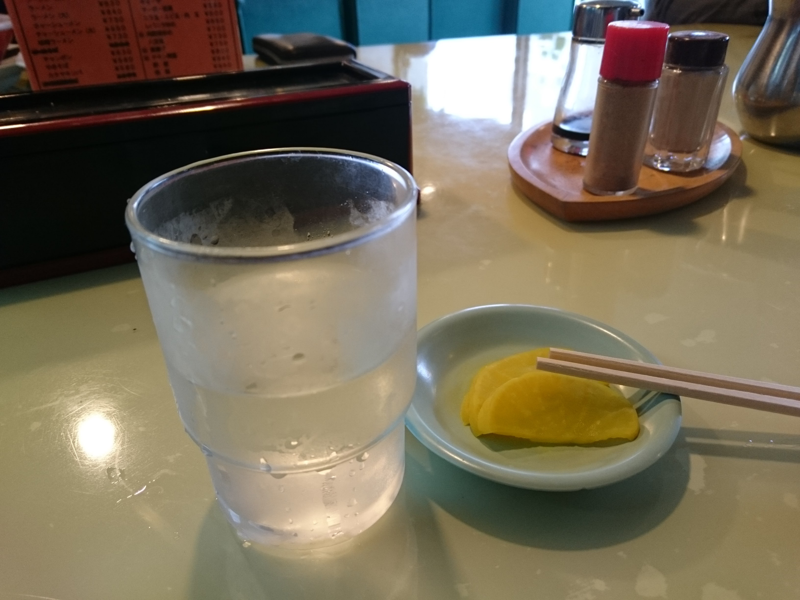 調理の合間に水とタクアンを持ってきて