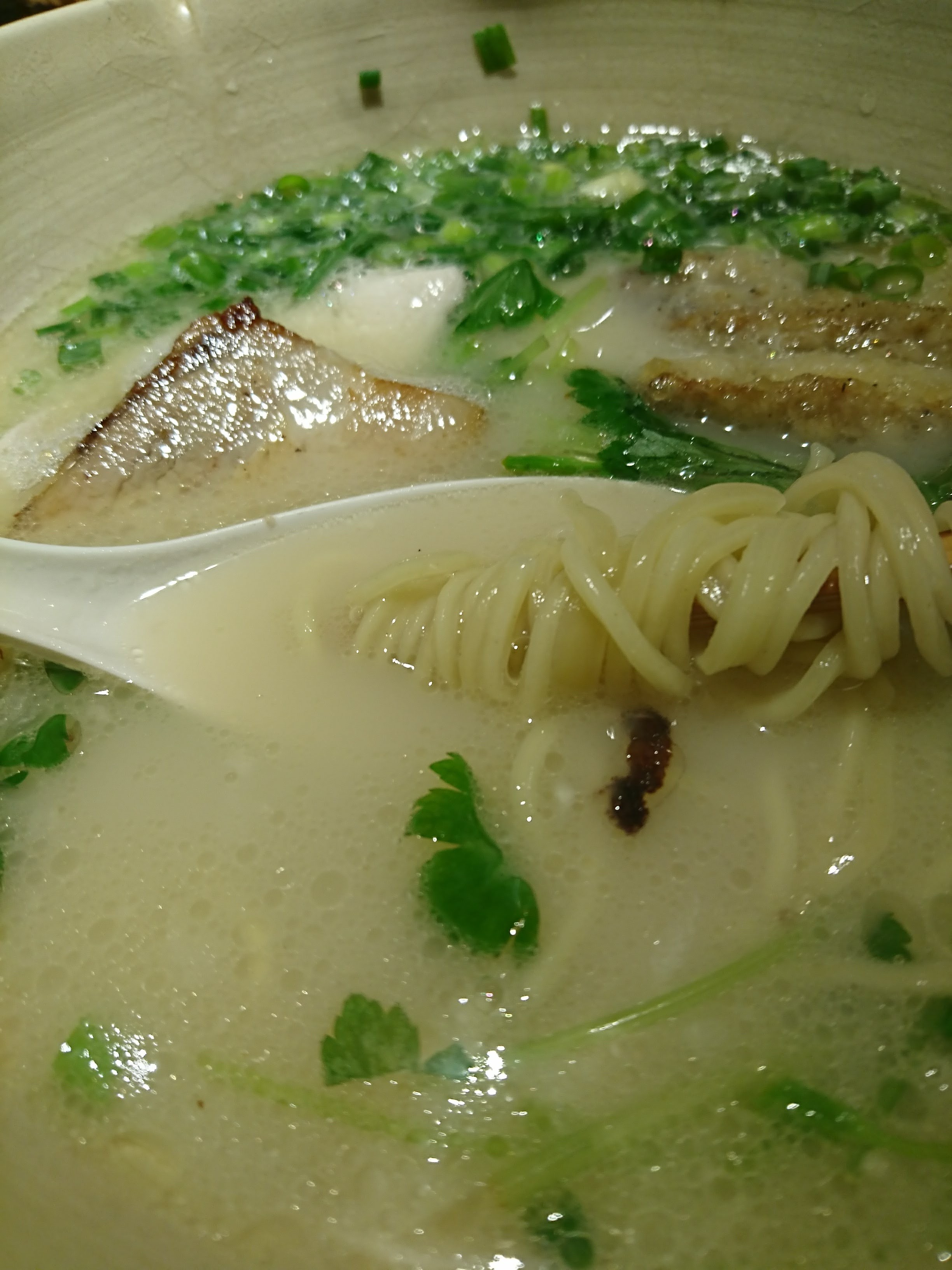 やや黄みがかった白湯スープに