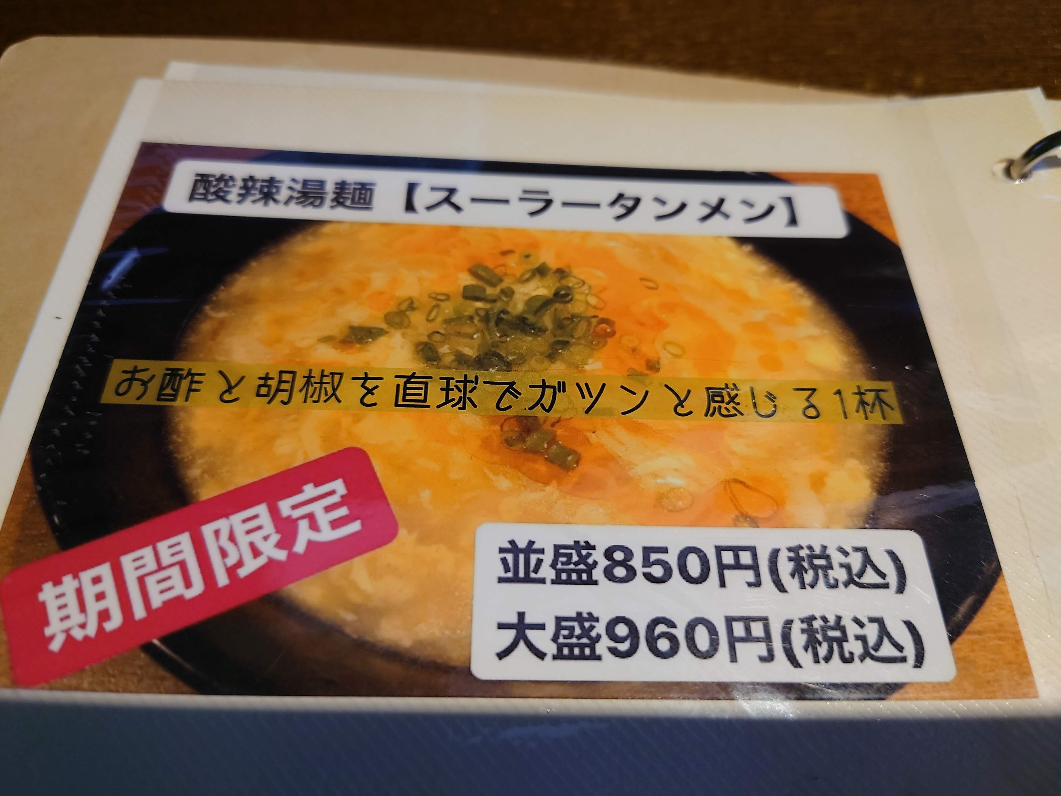 僕も昨日伺いました!いつもほとんど塩ラーメンしか食べてなかったんですが…酸辣湯麺ほんと絶品でした!!なぜ今まで頼まなかったのか後悔…笑