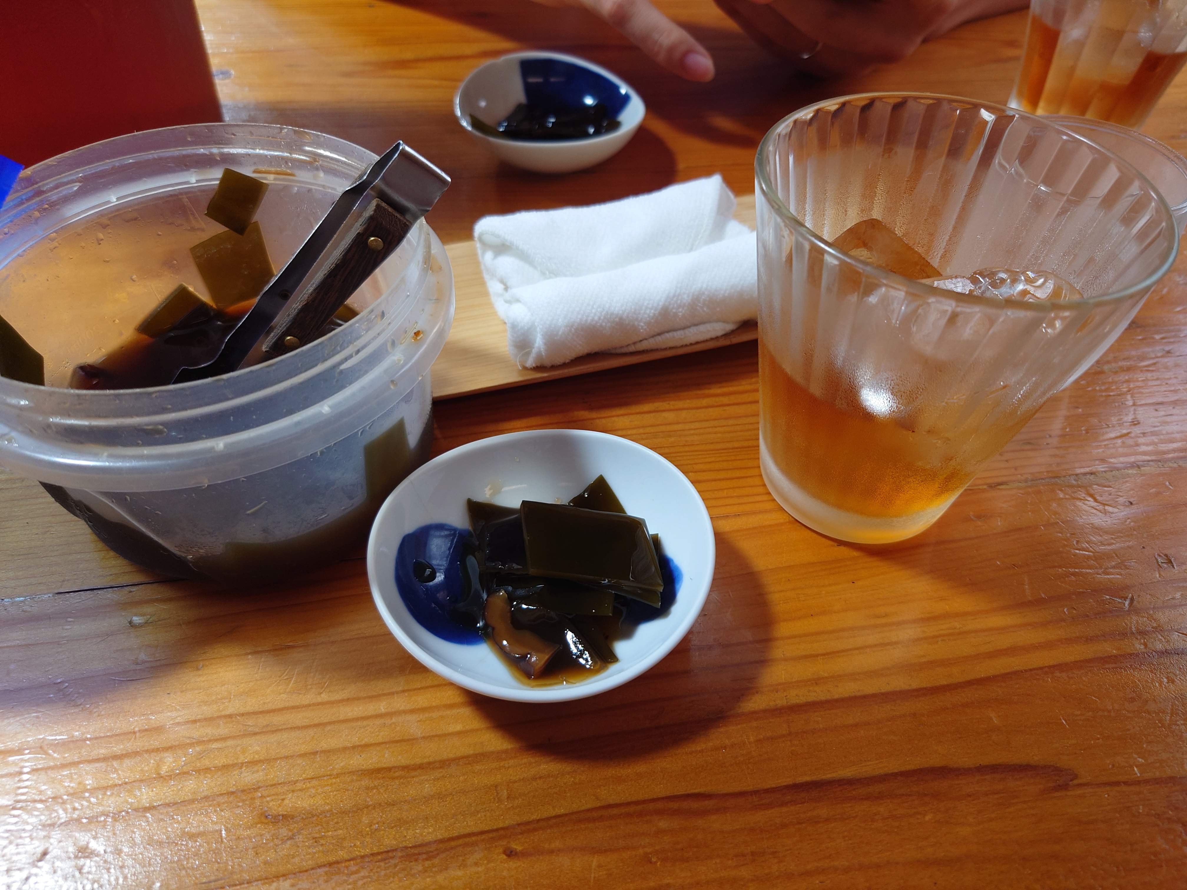 お茶請けはコンブとシイタケの佃煮。