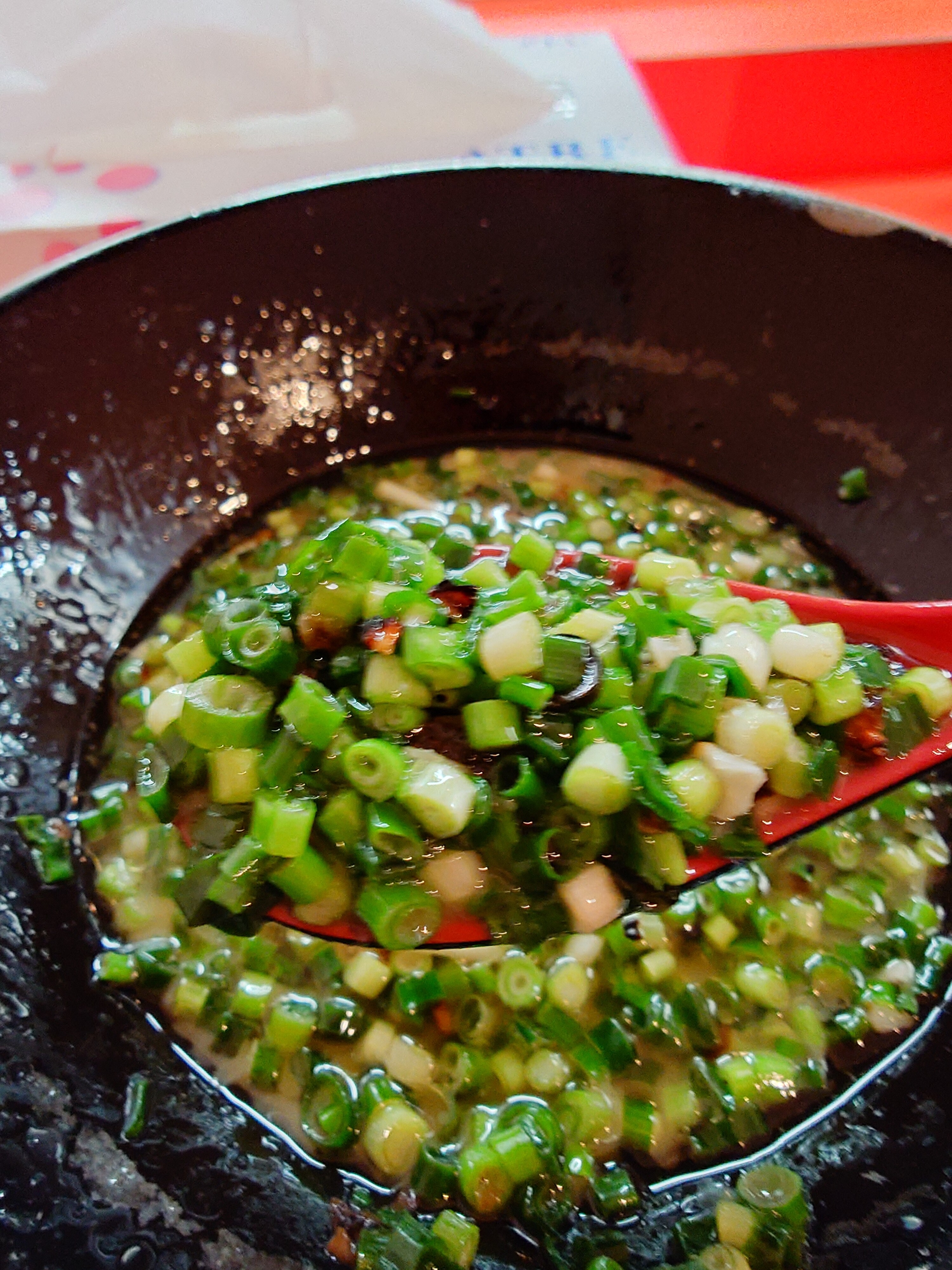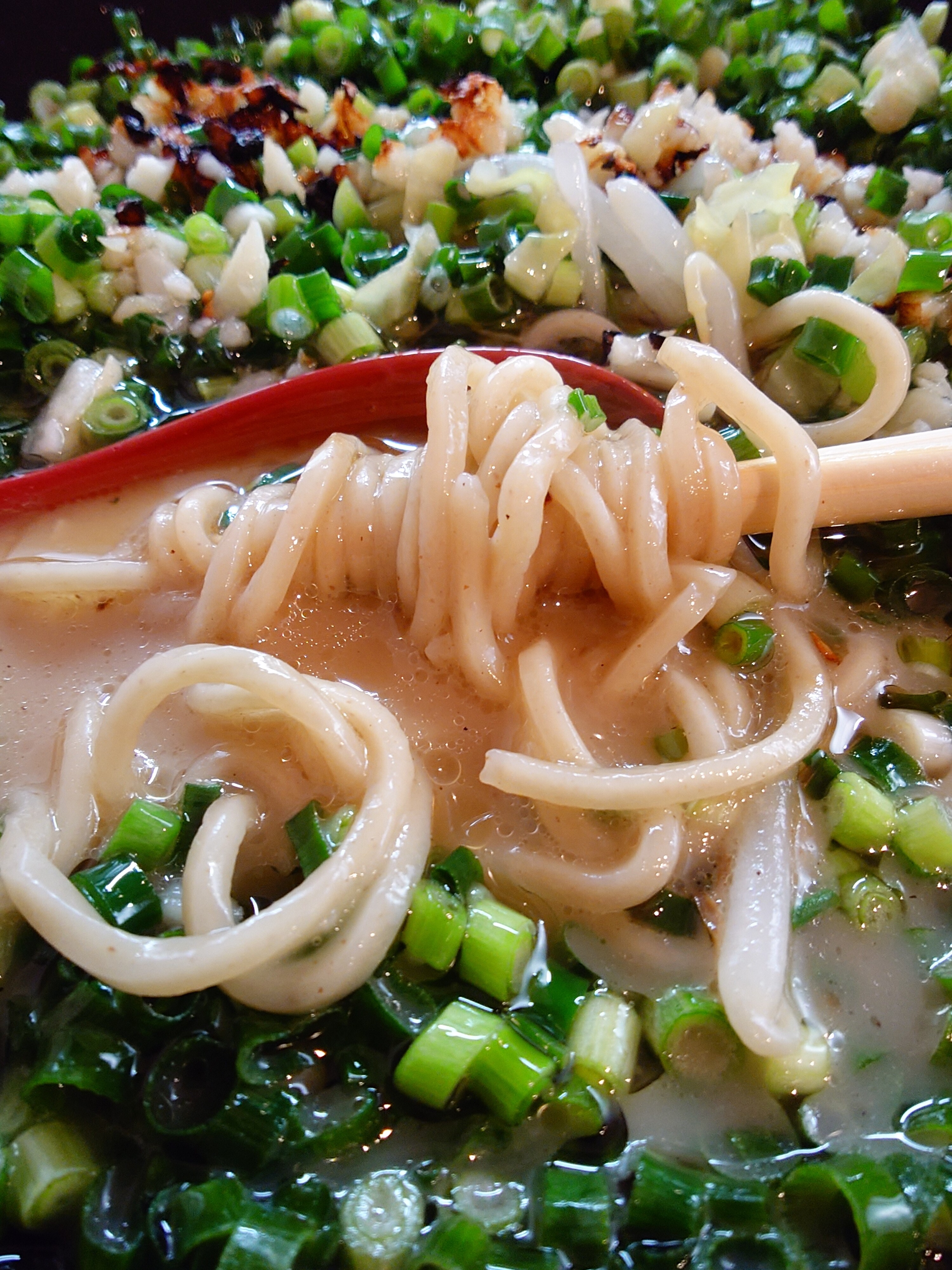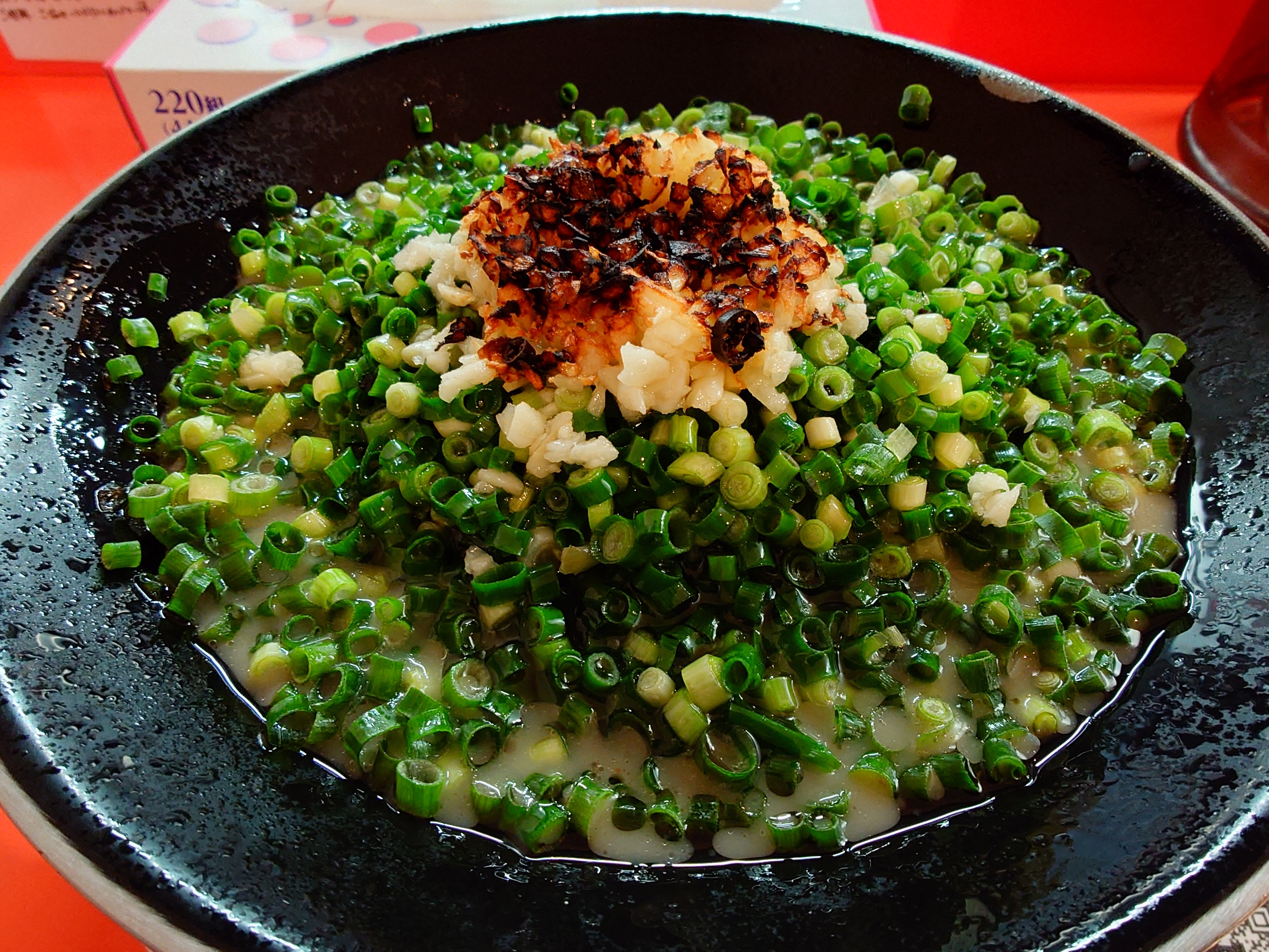 大量のネギや刻みニンニクの上から