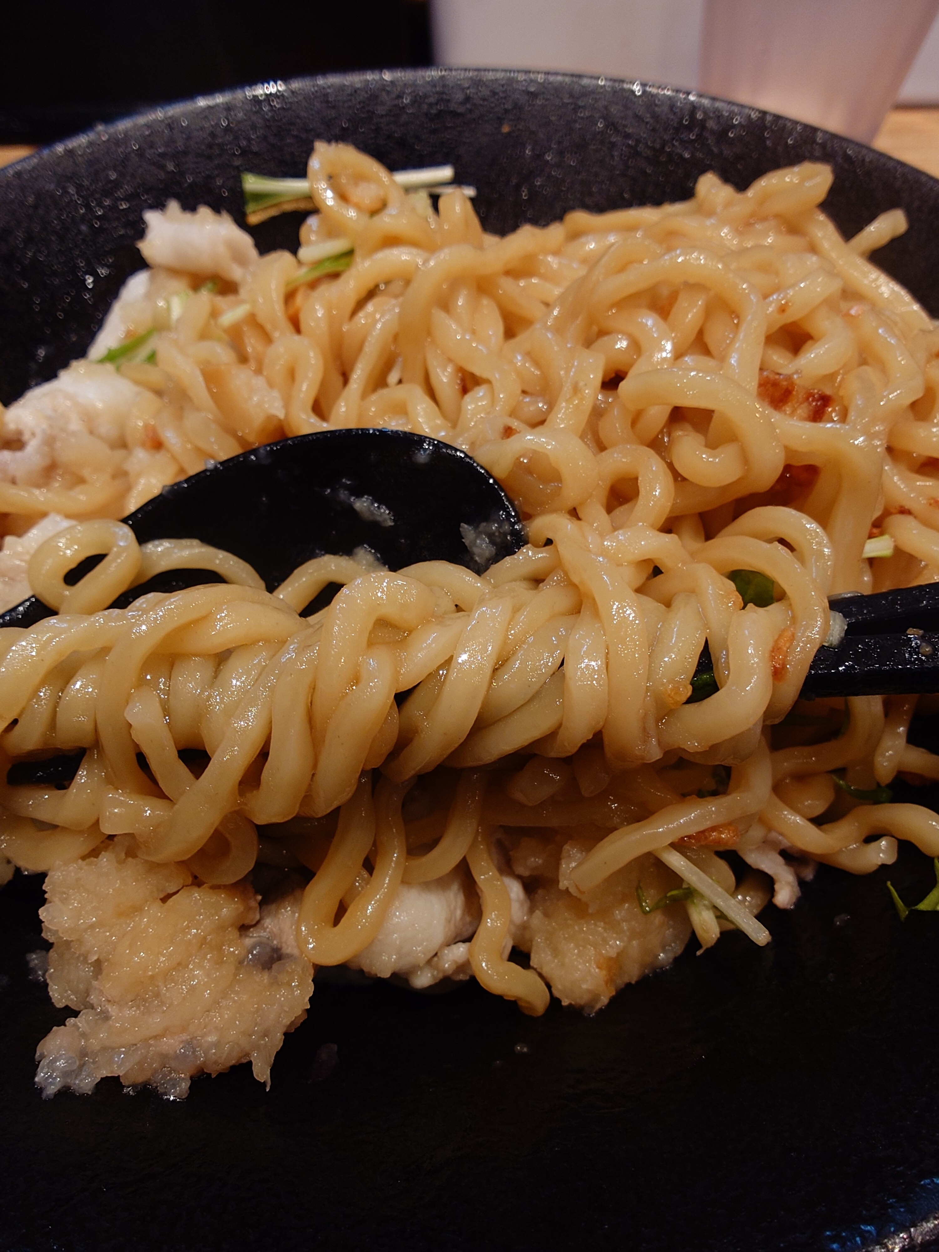 太麺に軽い味つけのタレがよく絡む。